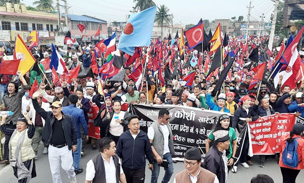 ५) कथित कोशी प्रदेश सभामा नाम खारेजी र पुनः नामाङ्कन प्रक्रिया २०८१ चैत १० गते सम्ममा राज्यपक्ष, ८२ सांसद र दलहरूबाट अगाडि नबढे राष्ट्रिय सहिद लाजेहाङको स्मृति दिवसको सोही दिनबाट प्रदेश नं. १ संसद घेराउ, मुख्यमन्त्री कार्यालय घेराउसहित अनिश्चितकालीन आम हड्ताल जस्ता कडा आन्दोलन हुने र प्रदेश नं. १ बाट कोशी नाम खारेजी र पुनः नामाङ्कनको आन्दोलनसँगै तेस्रो जनआन्दोलनको प्रस्थान विन्दु तय गर्दछौँ ।