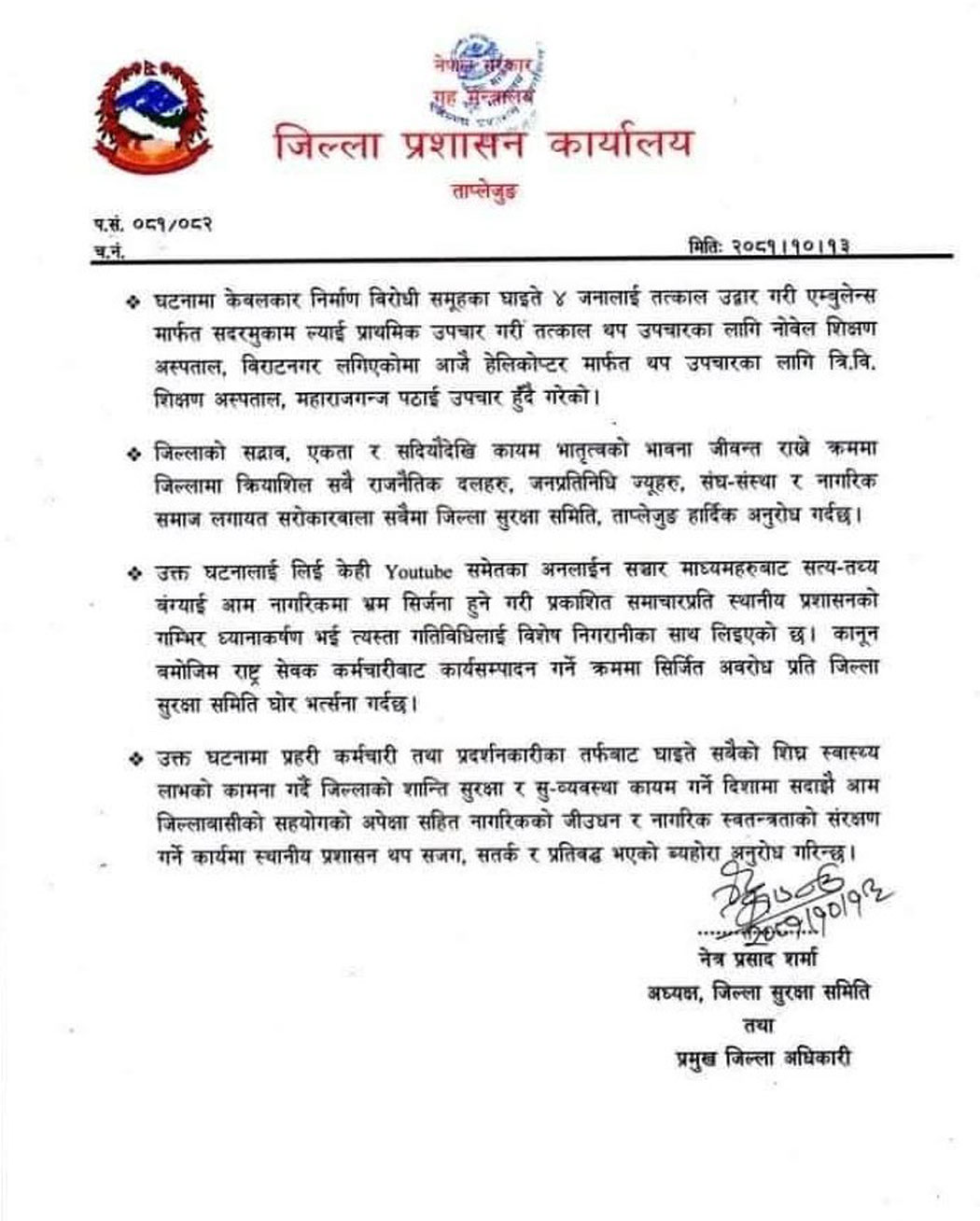 जिल्ला प्रशासन कार्यालय ताप्लेजुङले प्रेस विज्ञप्ति जारी गर्दै सो समूहले एक्कासि ढुङ्गा, चिपर्ट, दाउरा र गुलेली प्रहार गर्न थालेपछी उच्च संयमताका साथ परिचालित सुरक्षाकर्मीले आत्मरक्षाको अन्तिम विकल्पको रूपमा हवाई फायर गर्ने सम्मको अवस्था आएको जनाएको हो ।