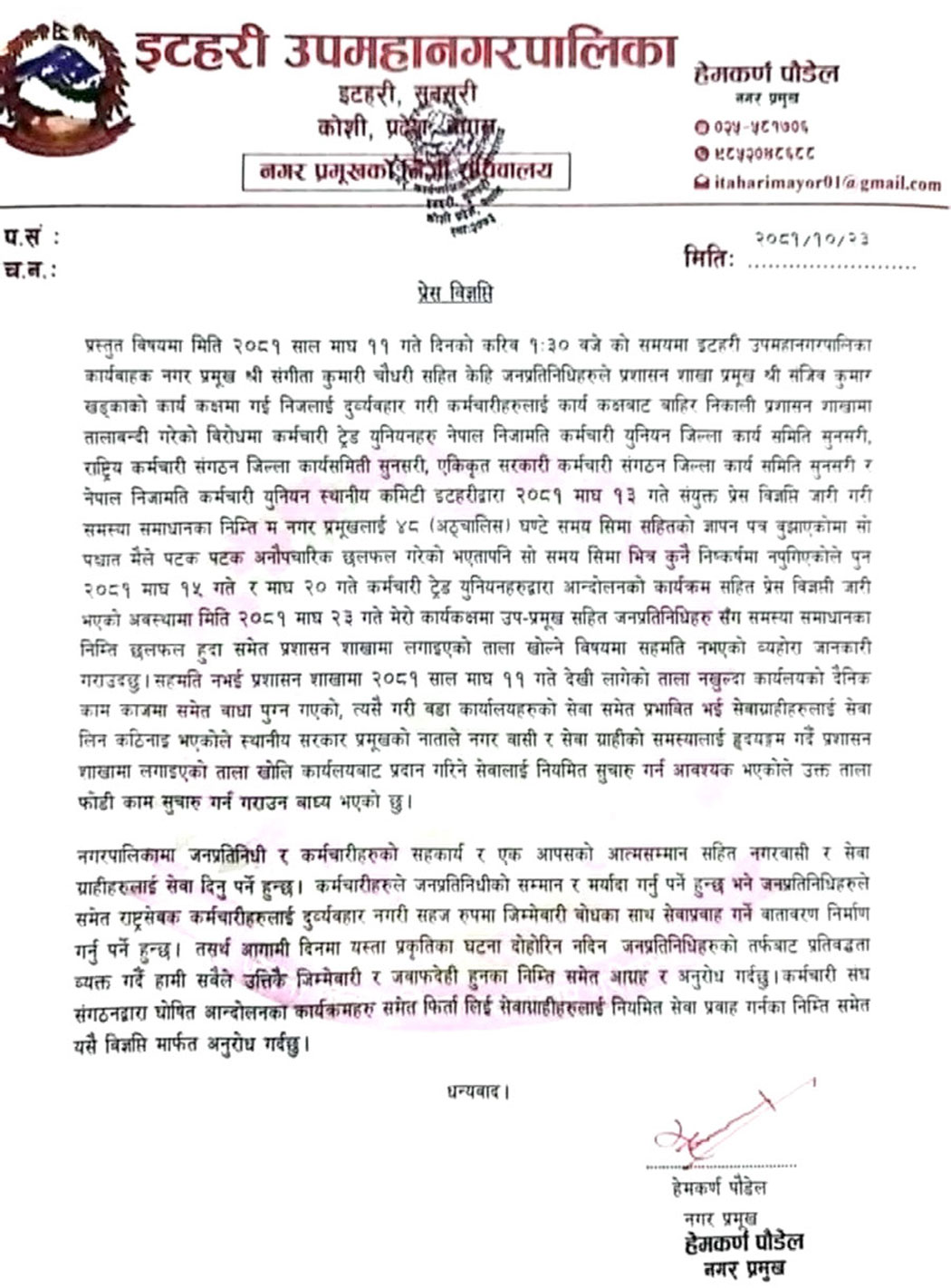 मेयर पौडेलले विज्ञप्ति जारी गर्दै भनेका छन्, ‘कर्मचारी ट्रेड युनियनहरूद्वारा आन्दोलनको कार्यक्रमसहित प्रेस विज्ञप्ति जारी भएको अवस्थामा २२ माघ २०८१ मा मेरो कार्यकक्षमा उपमेयरसहित जनप्रतिनिधिहरूसँग समस्या समाधानका निम्ति छलफल भएको थियो । तर, प्रशासन शाखामा लगाइएको ताला खोल्ने विषयमा सहमति हुन सकेन ।’