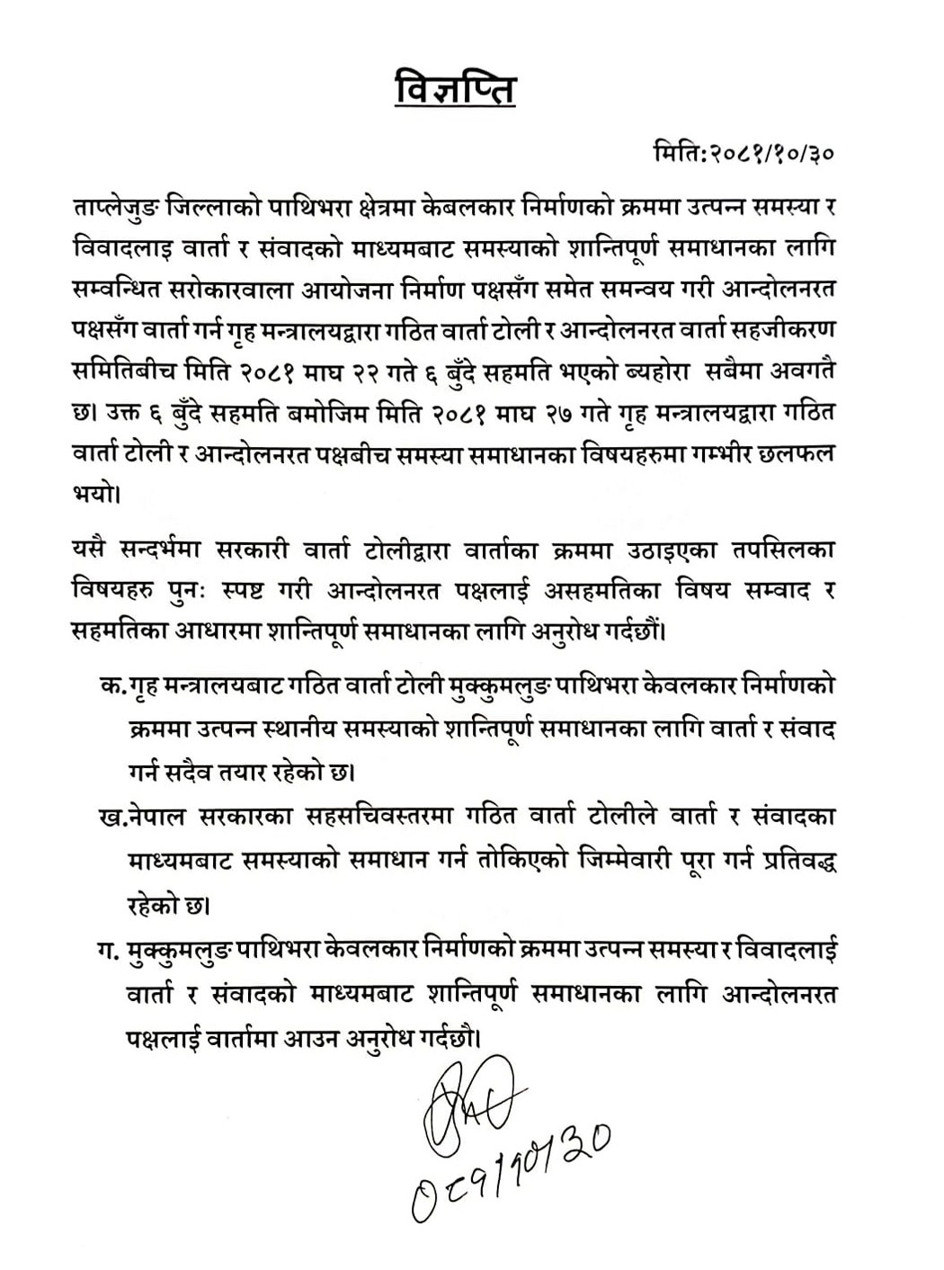 त्यसलगत्तै समितिले संवादका माध्यमद्वारा समस्याको समाधान गर्न सरकार प्रतिवद्ध रहेको उल्लेख गरेका छन् । गत माघ २२ गते सङ्घर्ष समिति र वार्ता टोलीबीच ६ बुँदे सहमति भएको थियो । सहमतिपछि रोकिएको आन्दोलन समितिले पुनः घोषणा गरेको थियो ।