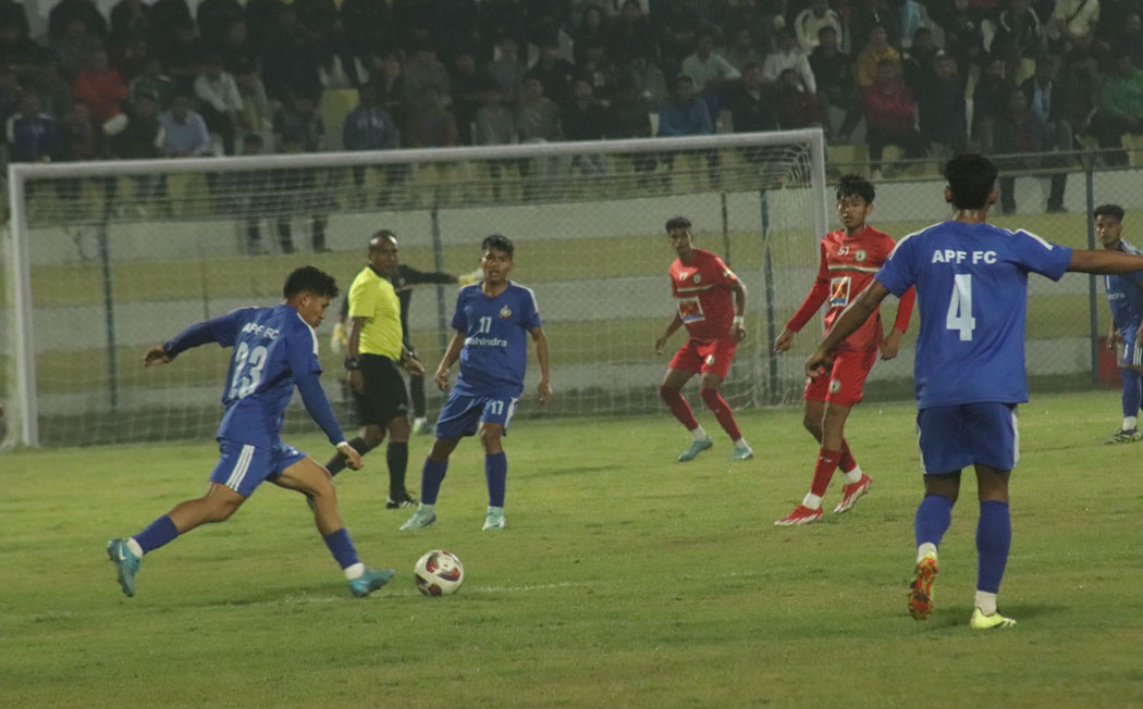विराटनगर । विभागीय टिम सशस्त्र प्रहरी बल (एपीएफ) विराट गोल्डकपको क्वाटरफाइनल प्रवेश गरेको छ । विराटनगरको सहिद रङ्गशालामा मङ्गलबार राती भएको खेलमा भारतको सुदेभा दिल्ली फुटबल क्बललाई टाइबेकरमा ५-३ गोलले हराउँदै एपीएफ क्वाटरफाइनल पुगेको हो ।