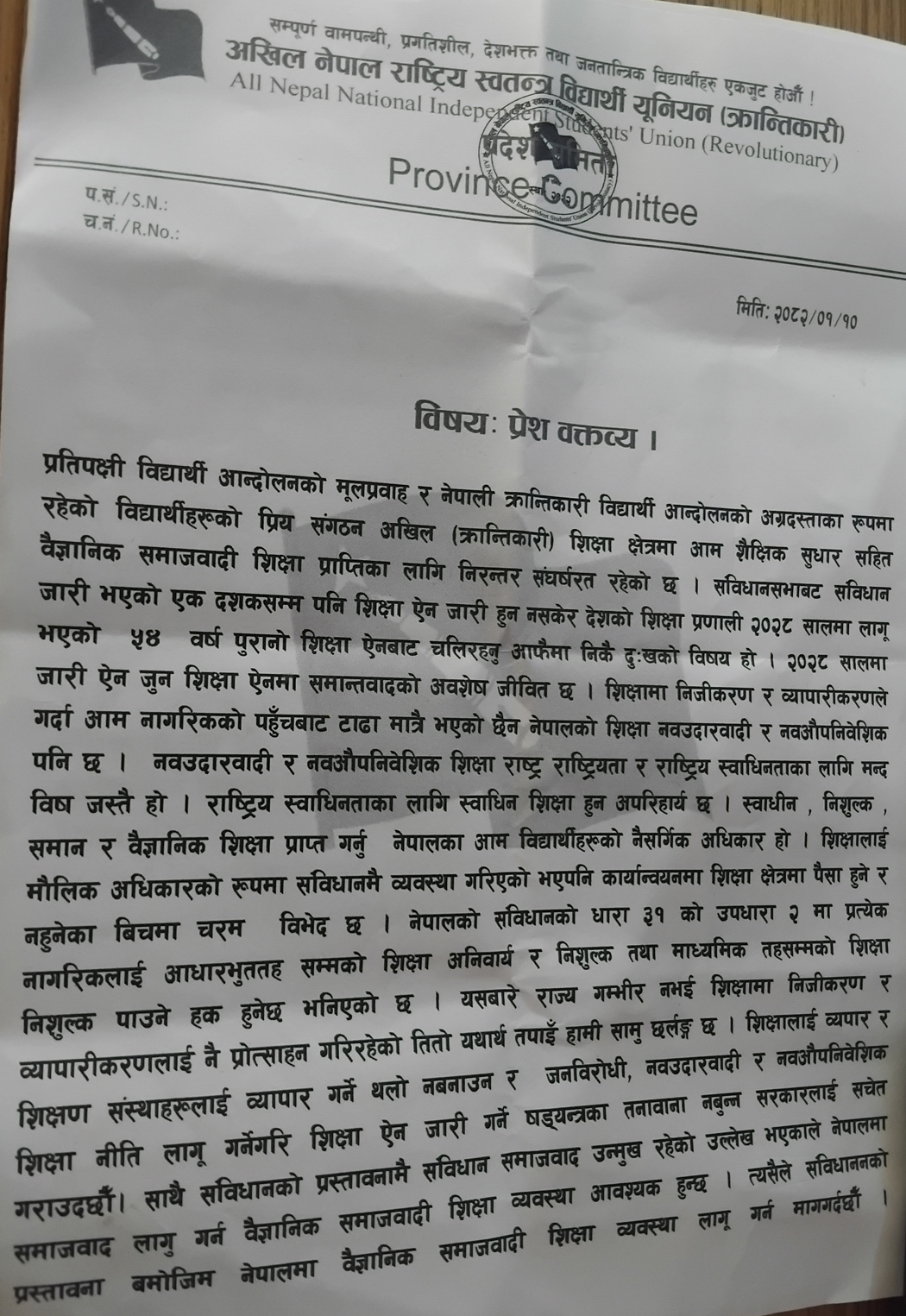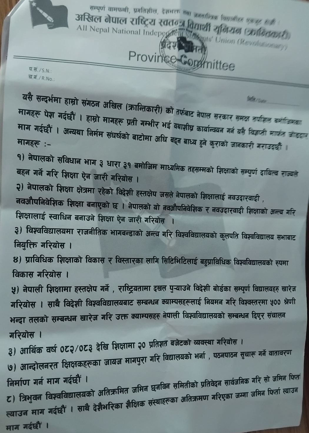 विराटनगर । अखिल नेपाल राष्ट्रिय स्वतन्त्र विद्यार्थी यूनियन (क्रान्तिकारी)ले शैक्षिक क्षेत्र सुधारका लागि विभिन्न मागहरू अघि सार्दै आन्दोलनको चेतावनी दिएको छ । आज कोशी प्रदेश समितिले विराटनगरमा पत्रकार सम्मेलन गर्दै १२ बुँदे माग सार्वजनिक गरेको हो ।