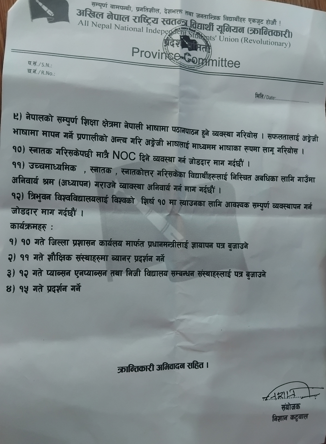 यूनियन कोशी प्रदेश संयोजक निशान कटुवालका अनुसार केन्द्रको समन्वयमा आज देशैभरबाट जिल्ला प्रशासन कार्यालयमार्फत ज्ञापनपत्र बुझाउने कार्यक्रम छ । यस्तै भोलि शैक्षिक संस्थाहरूमा ब्यानर प्रदर्शन गर्ने उनले बताए ।