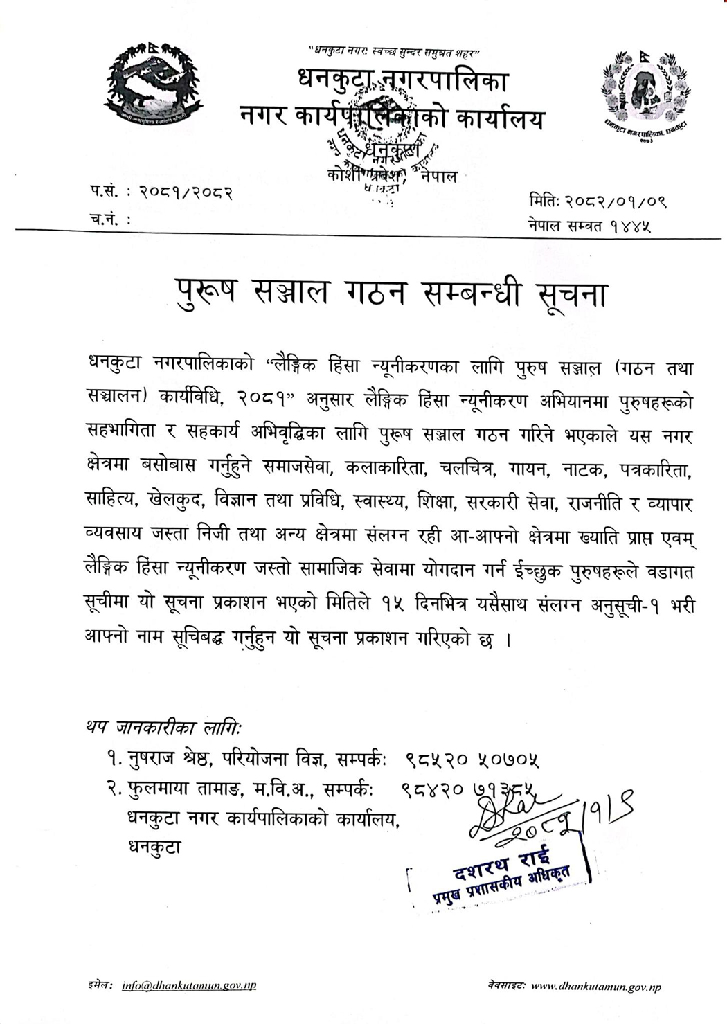 नगरभित्र बसोबास गर्ने जुनसुकै पेसा वा व्यवसायमा आवद्ध पुरुषहरूलाई सूचना प्रकाशन भएको मितिले १५ दिनभित्र सूचीबद्ध हुन प्रमुख प्रशासकीय अधिकृत दशरथ राईद्वारा जारी गरिएको सूचनामा भनिएको छ ।