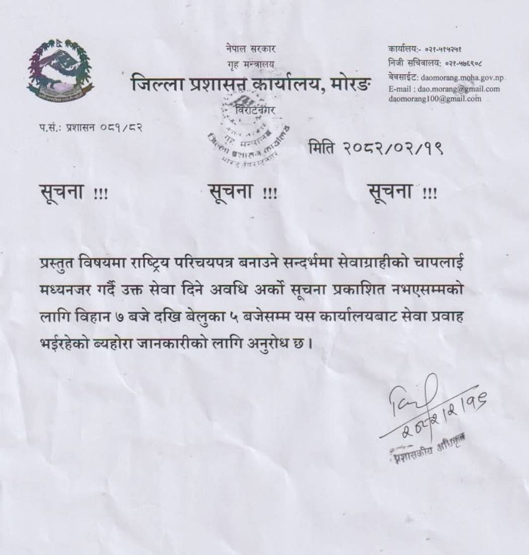 राष्ट्रिय परिचयपत्र बनाउने सेवाग्राहीको चाप बढेपछि उनीहरूको सहजताका लागि बिहान ७ बजेदेखि नै कार्यालय खुला गर्न थालिएको मोरङका प्रमुख जिल्ला अधिकारी इन्द्रदेव यादवले जानकारी दिए ।