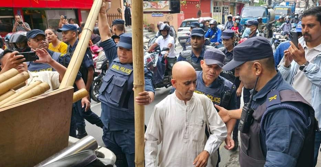 उनी माइतीघर मण्डलामा कपाल मुण्डन गरेर सेतो कपडा लगाएर परालको गुन्द्री माथि कम्बल ओछ्याएर बसेका छन् । उनले छेउमा बाँसका टुक्रा पनि राखेका छन् ।