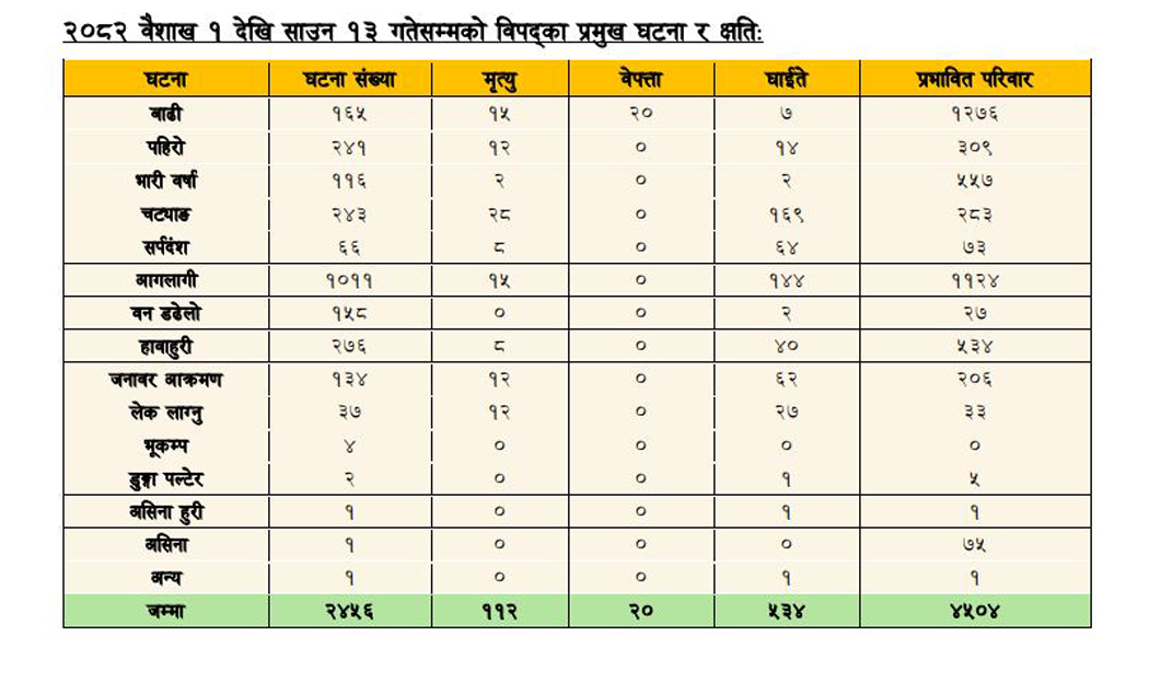 त्यसैगरी लेक लागेर १२ जनाको मृत्यु भएको छ भने २७ जना घाइते भएका छन् । सबै घटनाबाट चार हजार पाँच सय चार घरपरिवार प्रभावित भएका प्राधिकरणले जनाएको छ ।
