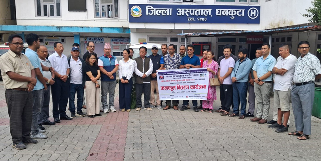 धनकुटा । नेपाल निजामती कर्मचारी सङ्गठन धनकुटाले जिल्ला अस्पतालमा उपचाररत बिरामीहरूलाई फलफूल वितरण गरेको छ । सहिदहरू मनोज, झपेन्द्र र सुरेन्द्रको स्मृति दिवसको अवसर पारेर राष्ट्रसेवक बचत तथा ऋण सहकारी संस्थासँग समन्वय गरी जिल्ला अस्पतालमा रहेका २१ जना बिरामीहरूलाई फलफूल वितरण गरिएको हो ।