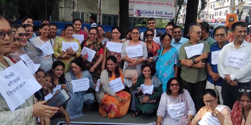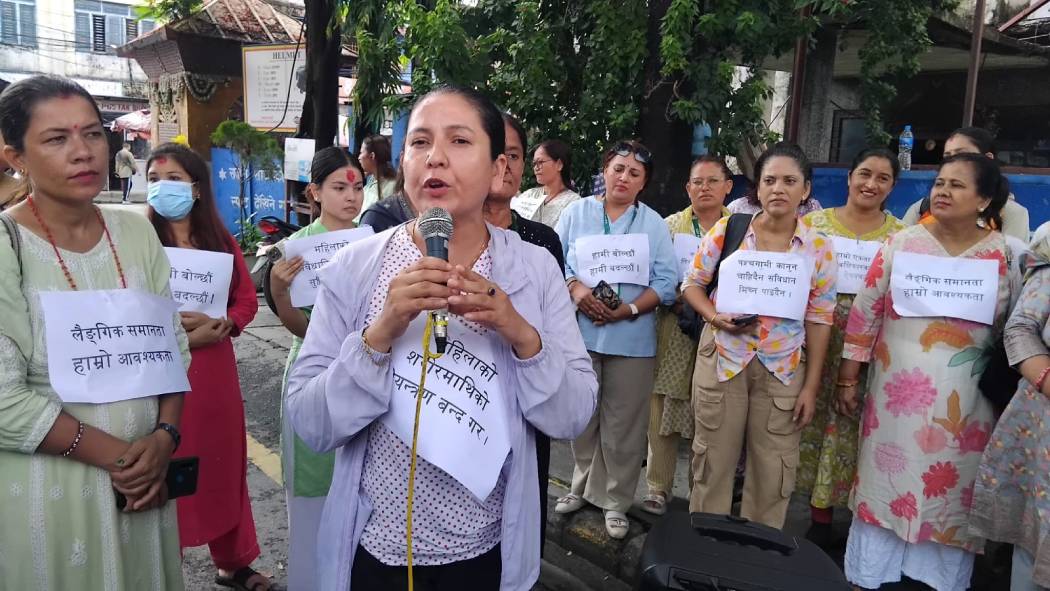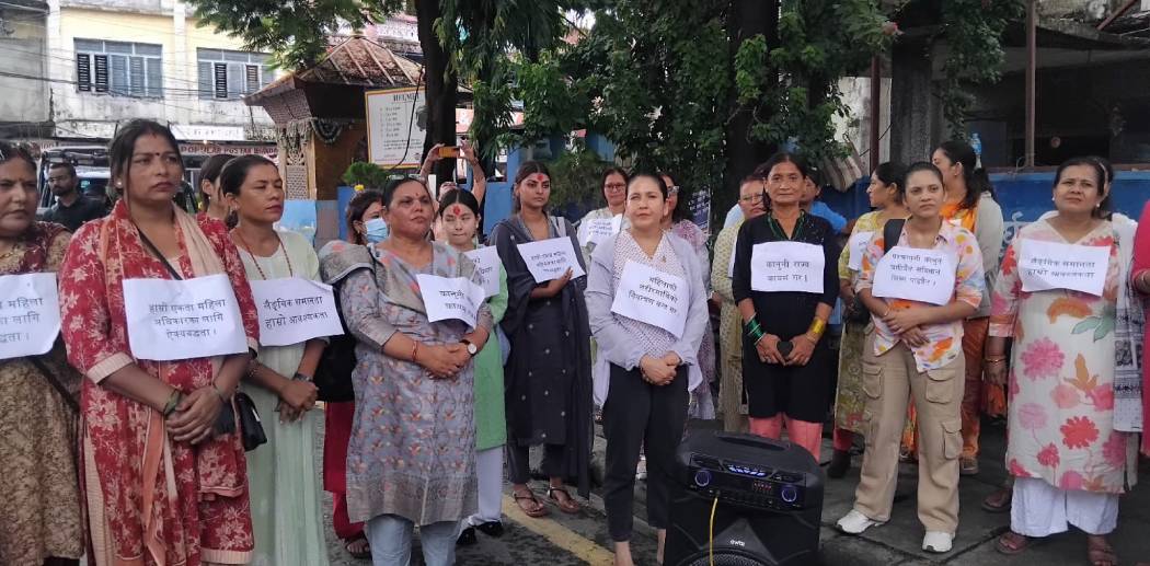 ‘महिलाको शरीरमाथिको नियन्त्रण बन्द गर’, ‘हाम्रो एकता महिला अधिकारका लागि ऐक्यवद्धता’, ‘नेताहरू सावधान आफ्नो बोलीमा देउ लगाम’, ‘संविधान विरोधी सबैखाले फैसला छैन हाम्रो स्वीकार्यता’ लगायतका प्ले कार्डसहित उनीहरू विरोधमा उत्रिएका थिए ।
