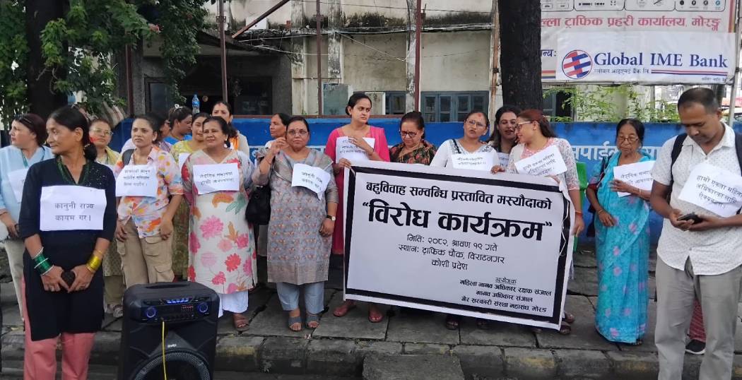 विराटनगर । विराटनगरमा बहुविवाह सम्बन्धी प्रस्तावित मस्यौदाको विरोध गरिएको छ । आज महिला मानव अधिकार रक्षक संजाल, मानव अधिकार संजाल र गैर सरकारी संस्था महासंघ मोरङले संयुक्तरूपमा विरोध गरेका हुन् ।