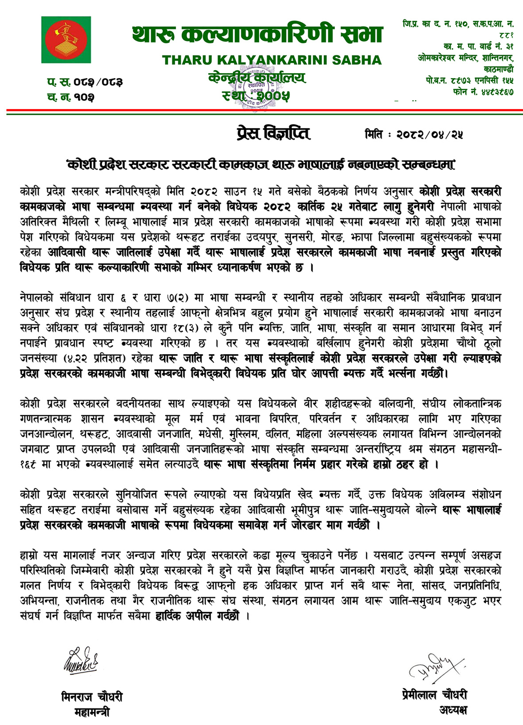 उदयपुर, सुनसरी, मोरङ र झापा जिल्लामा बहुसंख्यकरूपमा रहेका आदिवासी थारू जातीलाई उपेक्षा गर्दै थारू भाषालाई प्रदेश सरकारले कामकाजी भाषा नबनाइ प्रस्तुत गरिएको विधेयकप्रति थारू कल्याणकारी सभाको गम्भीर ध्यानाकर्षण भएको छ’ सभाका महामन्त्री मिनराज चौधरी र अध्यक्ष प्रेमीलाल चौधरीद्वारा जारी विज्ञप्तिमा भनिएको छ ।