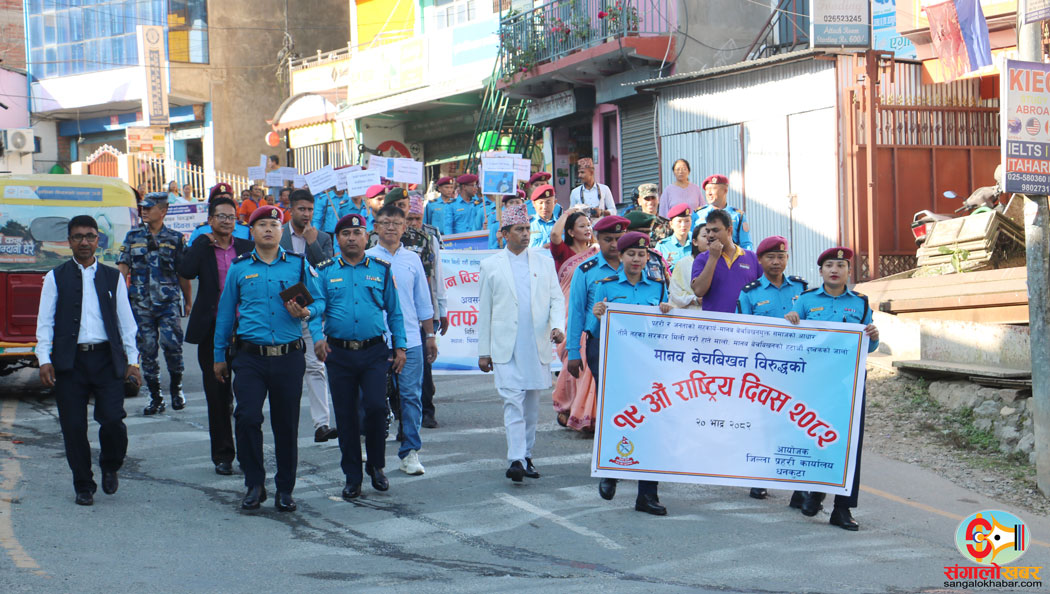 धनकुटा । मानव बेचबिखन विरुद्धको १९ औं राष्ट्रिय दिवसको अवसरमा आज धनकुटामा प्रभातफेरी गरिएको छ । ‘तीनै तहका सरकार मिली गरौँ हातेमालो: मानव बेचविखनको हटाऔं दुष्चक्रको जालो’ भन्ने मूल नारासहित धनकुटा नगरपालिका र जिल्ला प्रहरी कार्यालयको संयुक्त आयोजनामा प्रभातफेरी गरिएको हो ।