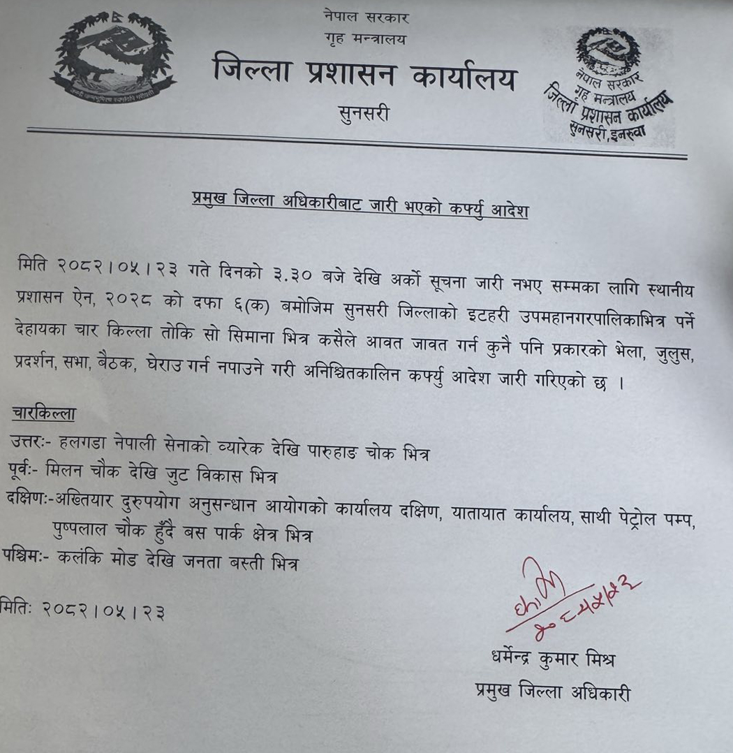 विराटनगर । इटहरी उपमहानगरपालिकामा कर्फ्यु आदेश जारी भएको छ । जेनजी पुस्ताले प्रदर्शनका क्रममा उपमहानगरपालिकामा आगजनी गर्नुका साथै ढुङ्गामुढा गरेपछि प्रशासनले अनिश्चितकालीन कर्फ्यु आदेश जारी गरेको हो ।