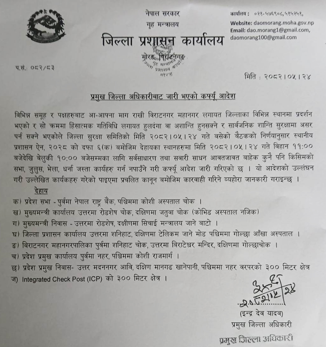 जिल्ला प्रशासन कार्यालय उत्तरमा शनिहाटदेखि दक्षिणमा टेलिकम मोड र पश्चिममा गोल्छा आँखा अस्पताल, विराटनगर महानगरपालिका क्षेत्र पूर्वमा शनिहाट चोकदेखि उत्तरमा विराटेश्वर मन्दिर, दक्षिणमा गोल्छा चोक, प्रदेश प्रमुखको कार्यालय क्षेत्र पूर्वमा नहर क्षेत्रदेखि पश्चिममा कोशी राजमार्गसम्म कर्फ्यु लगाइएको छ ।