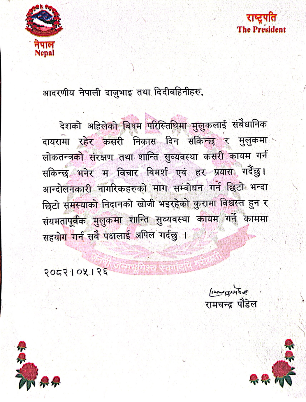 आन्दोलनकारी नागरिकहरूको माग सम्बोधन गर्न छिटो भन्दा छिटो समस्याको निदानको खोजी भइरहेको कुरामा विश्वस्त हुन उनले आग्रह गरेका छन् । यस्तै संयमतापूर्वक मुलुकमा शान्ति सुव्यवस्था कायम गर्ने काममा सहयोग गर्न सबै पक्षलाई अपिल गरेका छन् ।