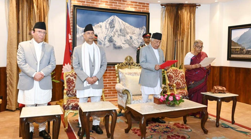 काठमाडौँ । नवनियुक्त प्रधानमन्त्री सुशीला कार्कीले पद तथा गोपनीयताको शपथ ग्रहण गरेकी छन् । शीतल निवासमा राष्ट्रपति रामचन्द्र पौडेलले कार्कीलाई शपथ ग्रहण गराएका हुन् ।