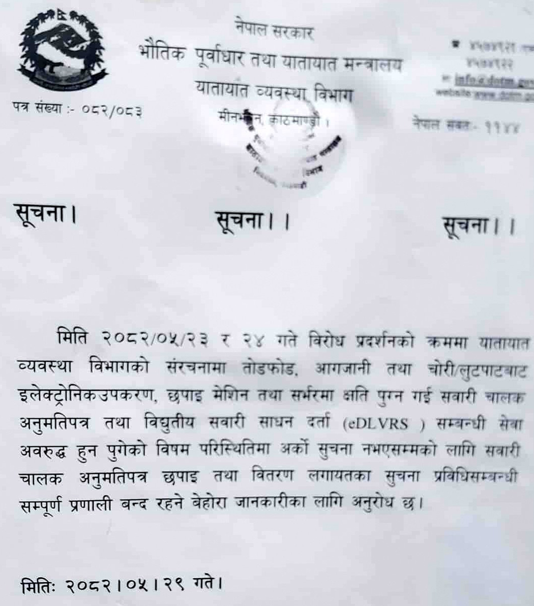 एक सूचना जारी गर्दै विभागले भदौ २३ र २४ गते भएको विरोध प्रदर्शनको क्रममा संरचनामा भएको तोडफोड, आगजनी र लुटपाटका कारण इलेक्ट्रोनिक उपकरण, छपाइ मेसिन र सर्भरमा क्षति पुगेको उल्लेख छ ।
