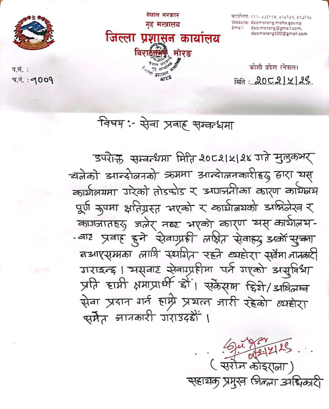 भदौ २४ गते भएको जेनजी आन्दोलनमा तोडफोड, लुटपाट तथा आगजनीका कारण कार्यालय पूर्णरूपमा क्षतिग्रस्त भएपछि कार्यालयबाट प्रवाह हुने सेवाहरू बन्द भएका हुन् ।