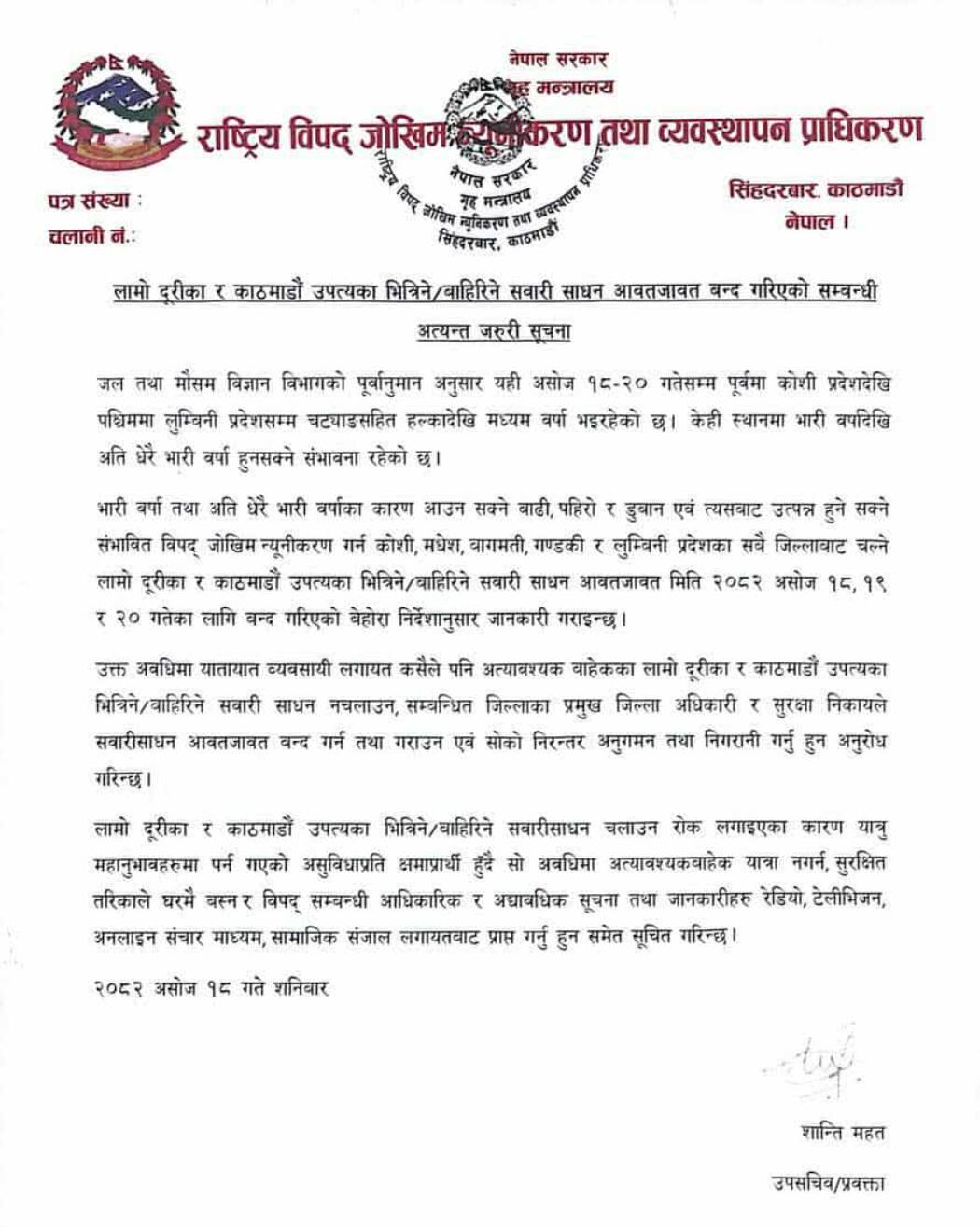 कोशी, मधेस, बागमती, गण्डकी र लुम्बिनी प्रदेशका सबै जिल्लाबाट चल्ने लामो दूरीका र काठमाडौं उपत्यका भित्रिने र बाहिरिने सवारी साधन आवतजावत मिति २०८२ असोज १८, १९ र २० गतेका लागि बन्द गरिएको प्राधिकरणले सूचनामार्फत जनाएको छ ।