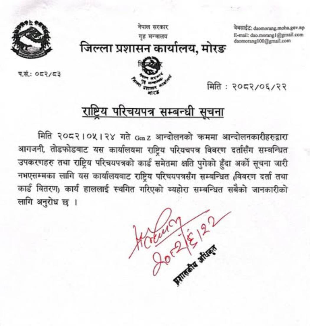 विराटनगर । जिल्ला प्रशासन कार्यालय मोरङले राष्ट्रिय परिचय पत्र दर्ता तथा कार्ड वितरण अनिश्चित कालका लागि स्थगित गरेको छ ।