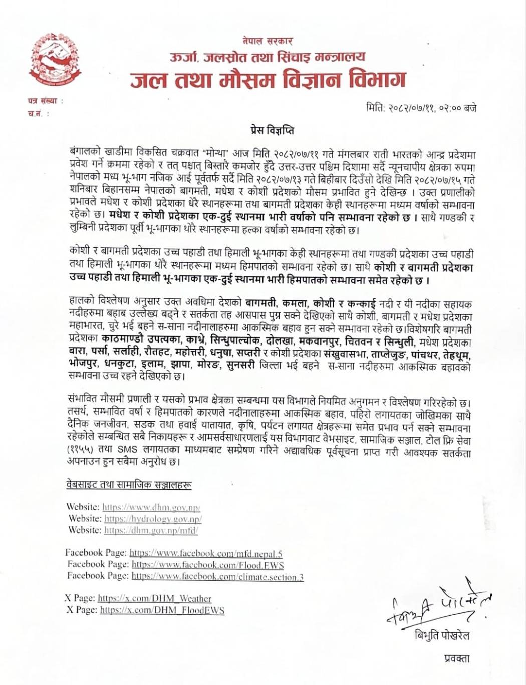 विभागले आज विज्ञप्ति जारी गर्दै ‘मोन्था’ को प्रभावले मधेश र कोशीका धेरै तथा बागमतीका केही ठाउँमा मध्यम तथा मधेश र कोशी प्रदेशका एक/दुई ठाउँमा अत्यधिक वर्षाको पनि सम्भावना रहेको जनाएको छ ।