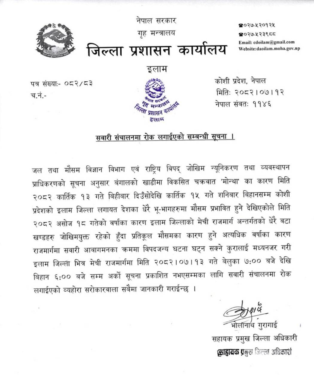 इलाम । मेची राजमार्गमा रातको समयमा गाडी सञ्चालनमा रोक लगाइएको छ । चक्रवात ‘मोन्था’ का कारण आजबाट इलामसहित देशका विभिन्न स्थानको मौसम प्रभावित हुने सम्भावना देखिएकाले गाडी सञ्चालनमा रोक लगाइएको हो ।