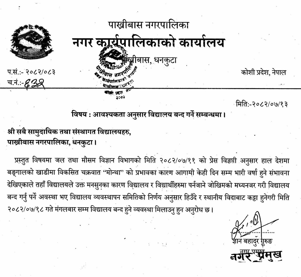 धनकुटा । धनकुटाको पाख्रीबास नगरपालिकाले मंगलबारसम्म विद्यालय बन्द गर्न अनुरोध गरेको छ । नगरपालिकाले आज सूचना जारी गर्दै चक्रवात ‘मोन्था’ को प्रभावले केही दिन भारी वर्षा हुने सम्भावना देखिएकाले जोखिम मध्यनजर गरेर विद्यालय बन्द गर्न अनुरोध गरेको हो ।