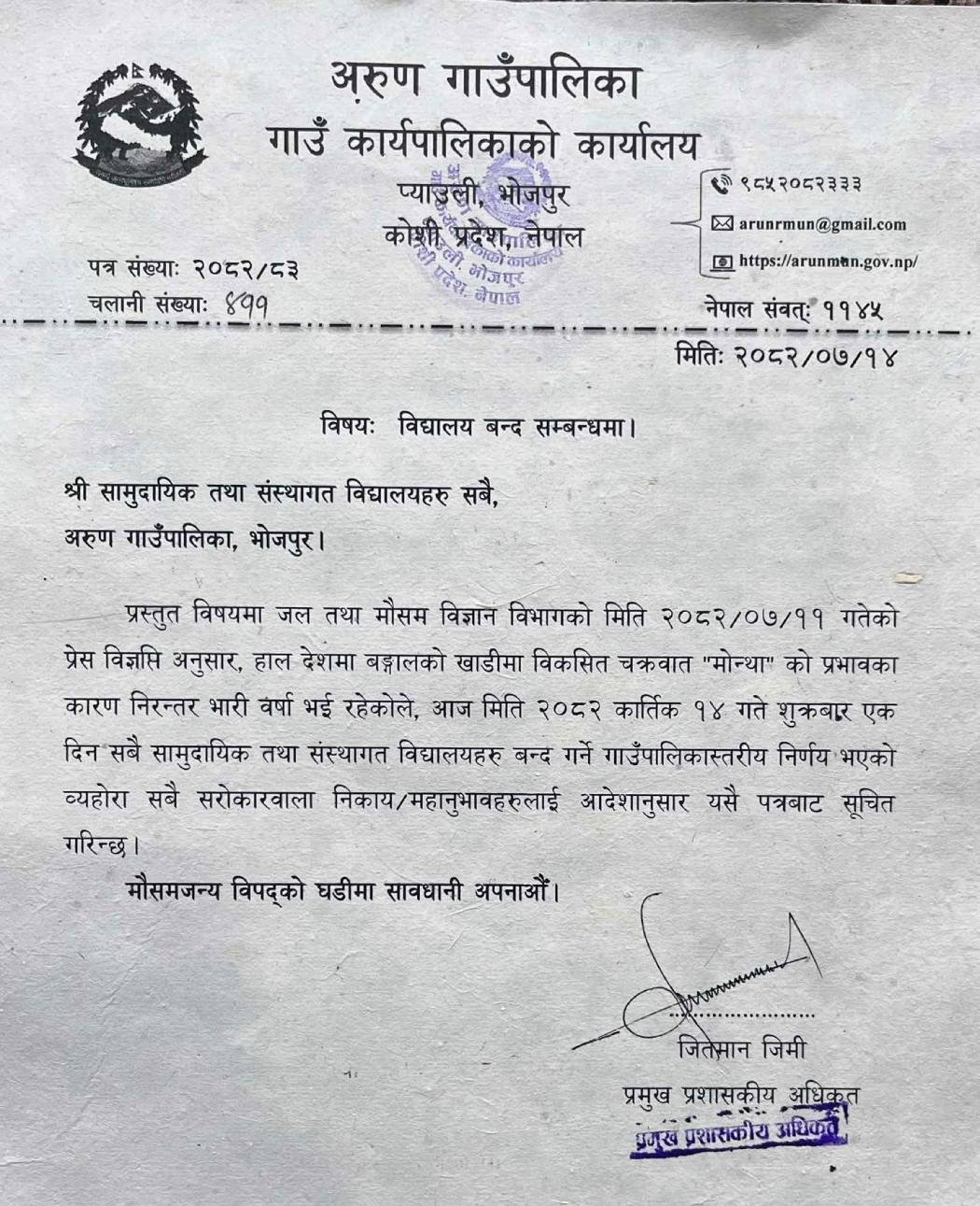 भोजपुर । बङ्गालको खाडीमा विकसित चक्रवात ‘मोन्था’ को प्रभावका कारण भोजपुरको अरुण गाउँपालिकाले विद्यालयहरू बन्द गर्ने निर्णय गरेको छ ।