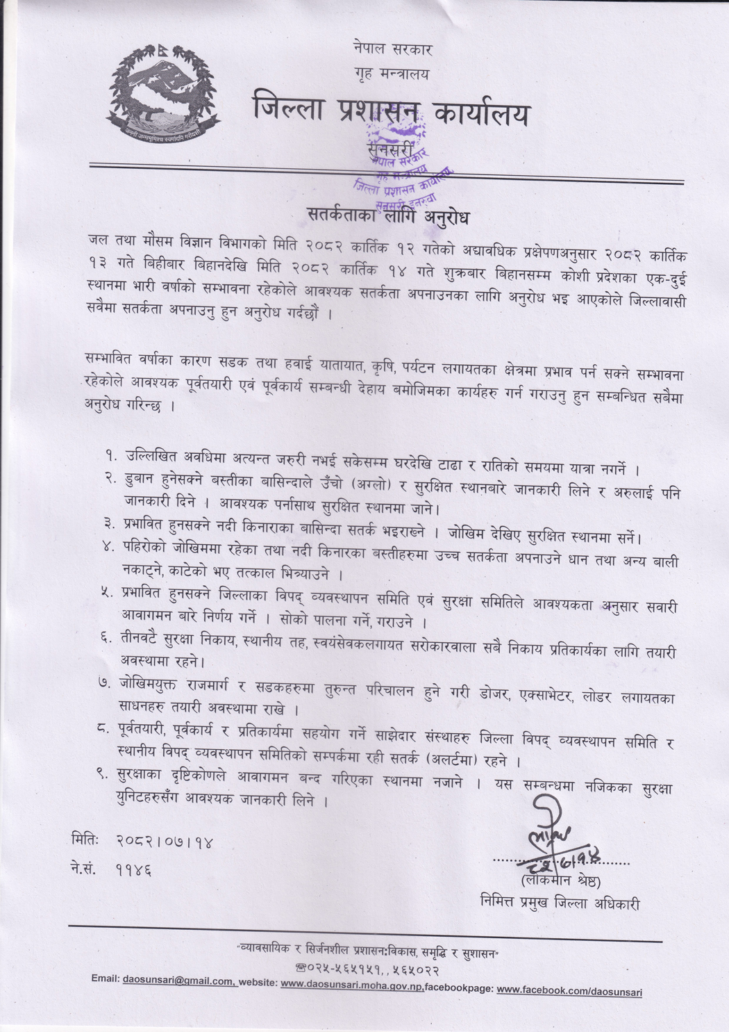 अविरल वर्षाका कारण डुबान हुन सक्ने भन्दै नदी किनारका बस्ती तथा प्रभावित हुनसक्ने क्षेत्रका बासिन्दालाई सतर्कता अपनाउन आग्रह गरेको छ ।