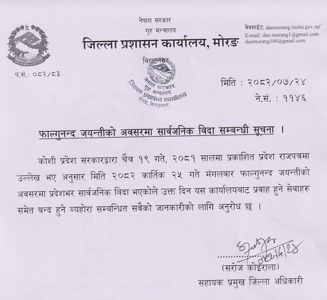 जिल्ला प्रशासन कार्यालय मोरङले सूचना जारी गर्दै भोलि कार्यालयबाट प्रवाह हुने सेवाहरू बन्द रहने जनाएको छ ।