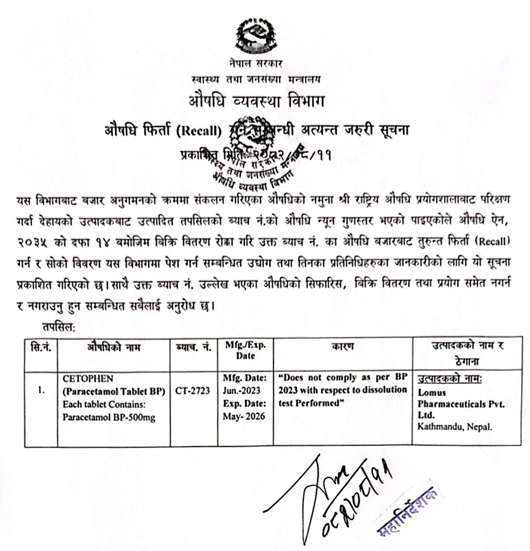 काठमाडौं । लोमश फर्मास्युटिकल्स प्रालिले उत्पादन गरेको प्यारासिटामोल गुणस्तरहीन पाइएपछि बजारबाट तत्काल फिर्ता गर्न निर्देशन दिइएको छ । औषधि व्यवस्था विभागले प्यारासिटामोल ट्याब्लेट (सेटोफेन) ब्याच नं. सीटी २७२३ गुणस्तरहीन पाइएपछि तत्काल बजारबाट फिर्ता गर्न निर्देशन दिएको हो ।