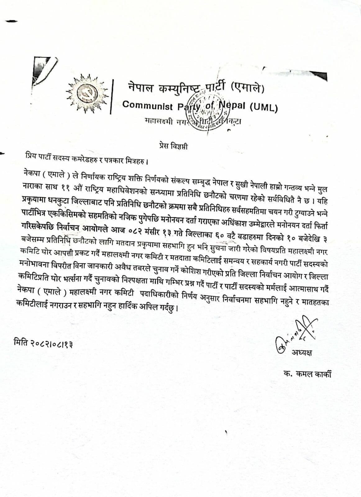 महालक्ष्मी नगर कमिटी अध्यक्ष कमल कार्कीले पालिका कमिटीलाई आधिकारिक जानकारी नै नगराई गुटका उम्मेदवारलाई जिताउन चुनावी प्रकृया थालिनु गलत भएको दावी गरे । पत्रकार सम्मेलनमा एमाले केन्द्रीय सदस्य सकुन्तला बस्नेतसहित एमाले नेताहरू चन्द्र बस्नेत, मञ्जु अधिकारी, बलदीप राई, निरेन तामाङ, तारा तितुङ लगायत सहभागि थिए ।