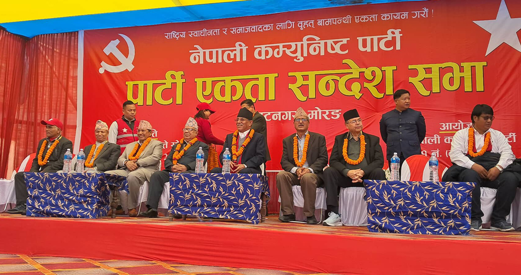 विराटनगर । विराटनगरमा नेपाली कम्युनिस्ट पार्टीको एकता सन्देश सभा सुरु भएको छ । विभिन्न १५ राजनीतिक दल मिलेर गठन भएको नेपाली कम्युनिस्ट पार्टीको कोशी प्रदेशस्तरीय एकता सन्देश सभा विराटनगरमा सुरु भएको हो ।