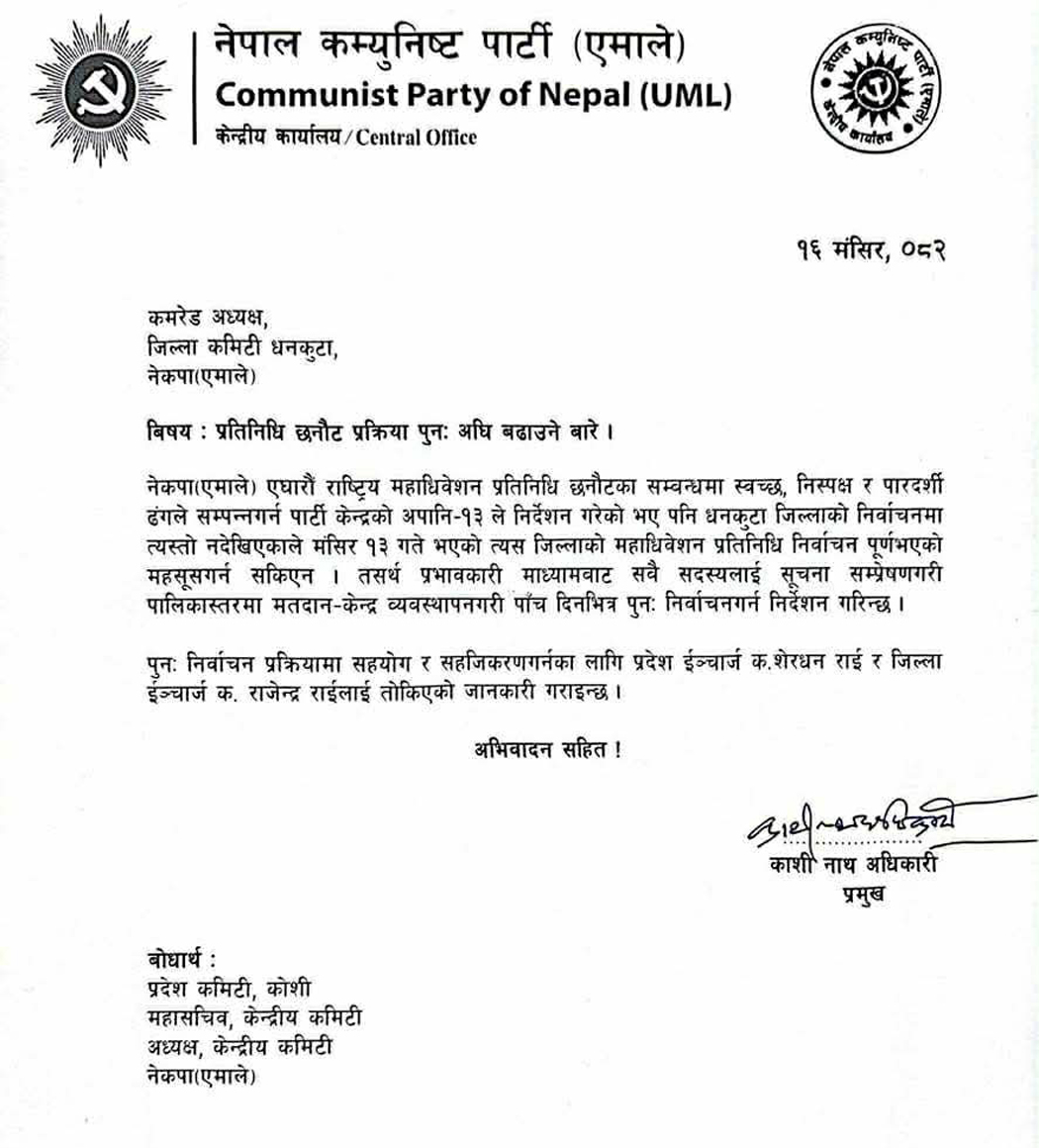 धनकुटा । धनकुटामा एमालेको राष्ट्रिय महाधिवेशनका लागि पुनः प्रतिनिधि छनोट प्रक्रिया अघि बढाउन केन्द्रीय कार्यालयले पत्राचार गरेको छ । मंगलबार एमाले धनकुटा जिल्ला कमिटीलाई पत्राचार गर्दै केन्द्रीय कार्यालयले पाँच दिनभित्र प्रतिनिधि छनोट गर्न निर्देशन दिएको छ ।