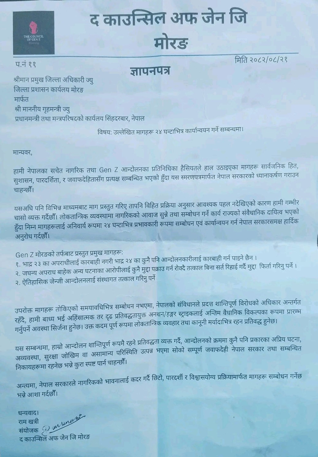 जेनजी मोरङले भदै २३ का अपराधीलाई कारबाही नगरी २४ गतेका कुनै पनि आन्दोलनकारीलाई कारबाही गर्न नपाइने, जघन्य अपराध बाहेक अन्य घटनाका आरोपीलाई कुनै मुद्दामा पक्राउ गर्न नपाइने र बिना सर्त रिहाइ गर्नुपर्ने र ऐतिहासिक जेनजी आन्दोलनलाई तत्काल संस्थागत गरिनुपर्ने माग राख्दै ज्ञापन पत्र बुझाएको छ ।