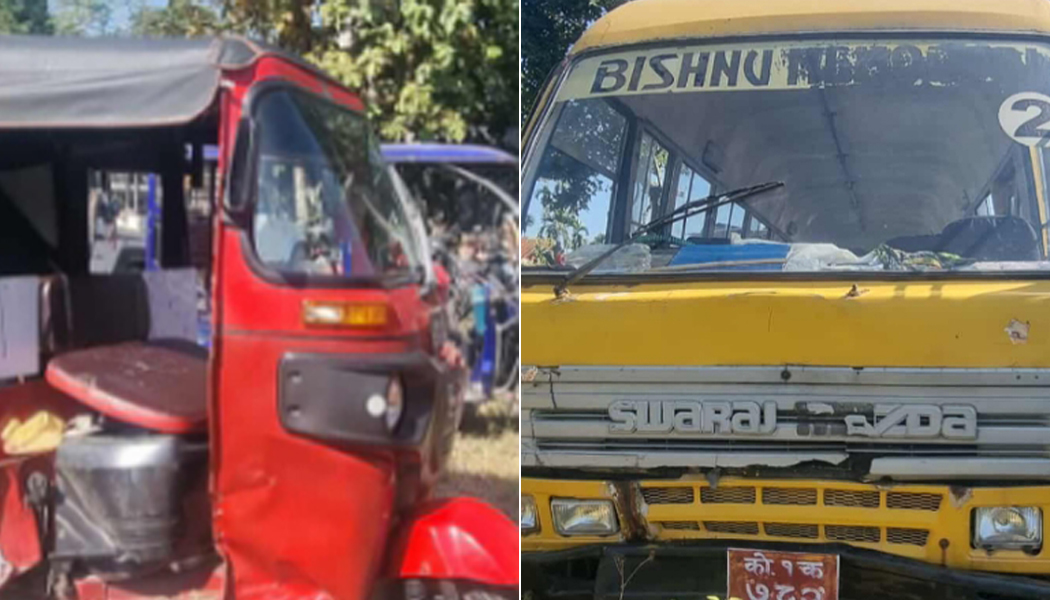 आज बिहान करिब ९ः४० बजे मिलनचोकबाट भोटेपुलतर्फ गइरहेको को १ क ७८२ नम्बरको विष्णु मेमोरियल स्कुलको बसले विपरीत दिशाबाट आइरहेको को १ ह ८७७४ नम्बरको अटोलाई ठक्कर दिएको थियो । अटोमा सवार धरान-१९ का ४८ वर्षीय टिकराम लिम्बु गम्भीर घाइते भएका छन् ।