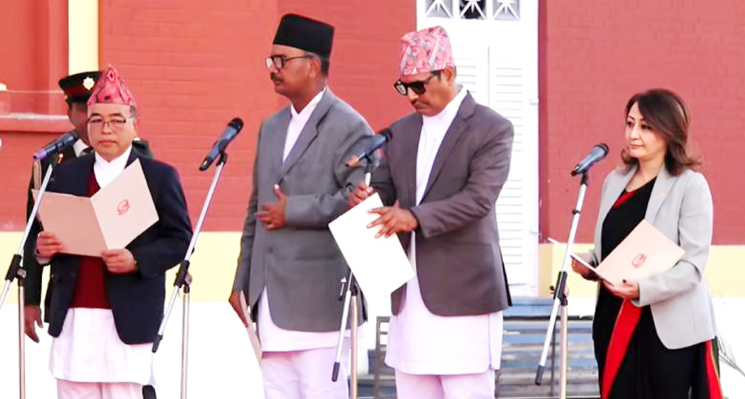 काठमाडौं । नवनियुक्त चार जना मन्त्रीहरूले पद तथा गोपनियताको शपथ लिएका छन् । नवनियुक्त मन्त्रीहरू श्रद्धा श्रेष्ठ, माधव चौलागाईं, राजेन्द्रसिंह भण्डारी र कुमार इङ्नामले सपथ लिएका हुन् ।