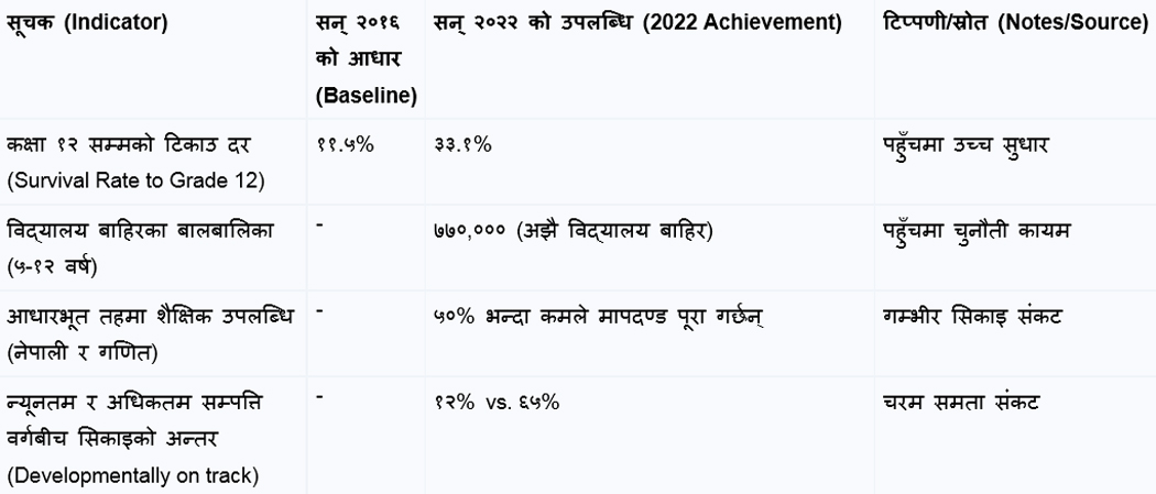 यति मात्र होइन, १२ देखि १४ वर्ष उमेर समूहका १८ प्रतिशत बालबालिकाले प्राथमिक शिक्षा पूरा गरेका छैनन् । प्रारम्भिक बाल विकास (ECE) मा उपस्थिति दर अझै पनि ५१ प्रतिशतमा सीमित छ । सिकाइ उपलब्धिहरूको मूल्याङ्कन गर्दा कक्षा ३, ५, र ८ का करिब आधा विद्यार्थीले मात्र नेपाली र गणित जस्ता मुख्य विषयहरूमा शैक्षिक उपलब्धि मापदण्ड पूरा गर्न सफल भएका छन् ।