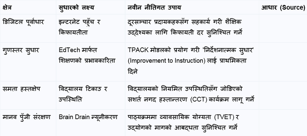 माथि उल्लिखित चुनौतीहरू र अन्तर्राष्ट्रिय नमुनाहरूको विश्लेषणका आधारमा, नेपालको शिक्षा प्रणालीलाई रूपान्तरण गर्न निम्न पाँच क्षेत्रमा प्राथमिकताका साथ सुधारहरू आवश्यक छन् :