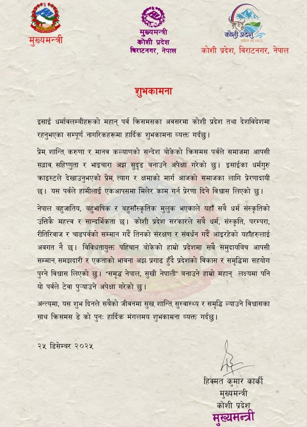 क्रिसमसको अवसरमा जारी शुभकामना सन्देशमा मुख्यमन्त्री कार्कीले प्रेम, शान्ति, करुणा र मानव कल्याणको सन्देश बोकेको यो पर्वले समाजमा आपसी सद्भाव, सहिष्णुता र भाइचारा अझ सुदृढ बनाउने विश्वास व्यक्त गरेका छन् ।