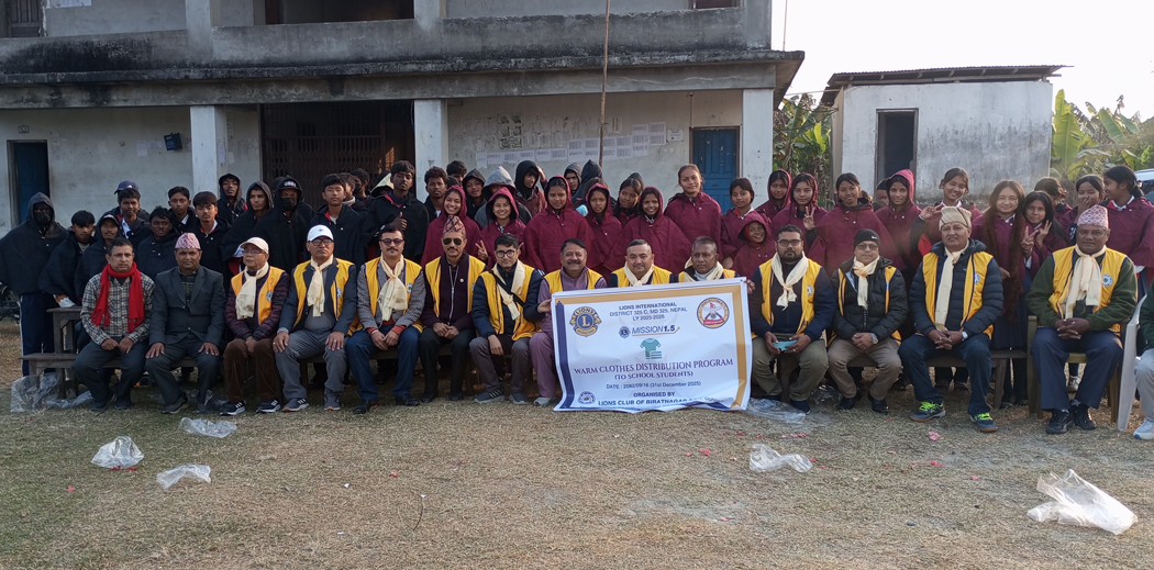 विराटनगर । मोरङको रंगेली नगरपालिका-१ स्थित त्रिभुवन माध्यमिक विद्यालयमा कक्षा ९ र १० मा अध्ययनरत ९३ जना विद्यार्थीलाई न्यानो कपडा वितरण गरिएको छ । लायन्स क्लब अफ विराटनगर सोसियलले जाडोको मध्यनजर गर्दै विद्यार्थीहरूलाई न्यानो कपडा वितरण गरेको हो ।