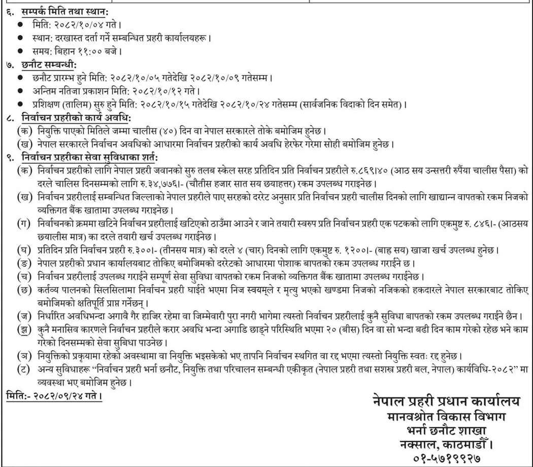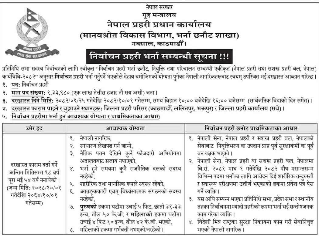 निर्वाचन सुरक्षालाई सुदृढ बनाउन ‘नेपाल प्रहरी तथा सशस्त्र प्रहरी बल नेपाल कार्यविधि २०८२’ अनुसार निर्वाचन प्रहरी (म्यादी) भर्नाको तयारी गरिएको हो ।
