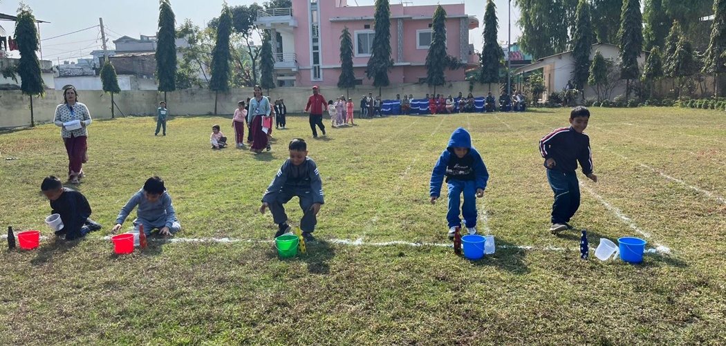 यस्तै एलकेजीका विद्यार्थीहरूको ‘स्विटर रेस’ र ‘वेट पौरिङ’ र यू केजीका विद्यार्थीहरूले ‘बेलुन फुटाउने’, ‘रेडि टु स्कुल’ ‘म्युजिकल चेयर’ र ५० मिटर दौडमा स्पर्धा गरेका छन् ।