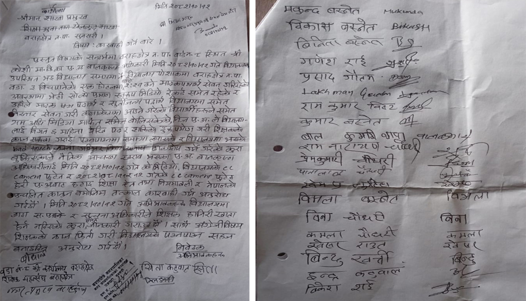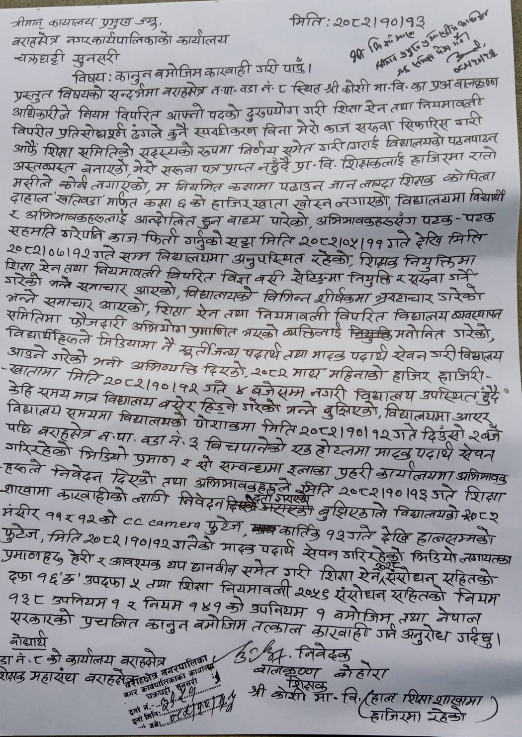 ‘विद्यालयमा १२ गते सिसी क्यामेरा फुटेज हेरेर उनलाई प्रअबाट हटाउन अनुरोध गर्दछौँ’, अभिभावकले शिक्षा शाखामा बुझाएको निवेदनमा भनिएको छ’, ‘शिक्षा ऐन तथा नियमावली तथा नेपालको प्रचलित कानुन अनुसार तत्काल कारबाहीको माग गर्दछौँ ।’