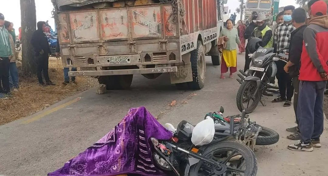 विराटनगर । इलामको सूर्याेदय नगरपालिका-७ पाल्टाङगेमा ट्रकले किच्दा मोटरसाइकलमा सवार एक जनाको मृत्यु भएको छ । आज बिहान भएको दुर्घटनामा मोटरसाइकलमा सवार झापाको बिर्तामोड-५ का ५० वर्षीय मनोज चौधरीको घटनास्थलमै मृत्यु भएको हो ।