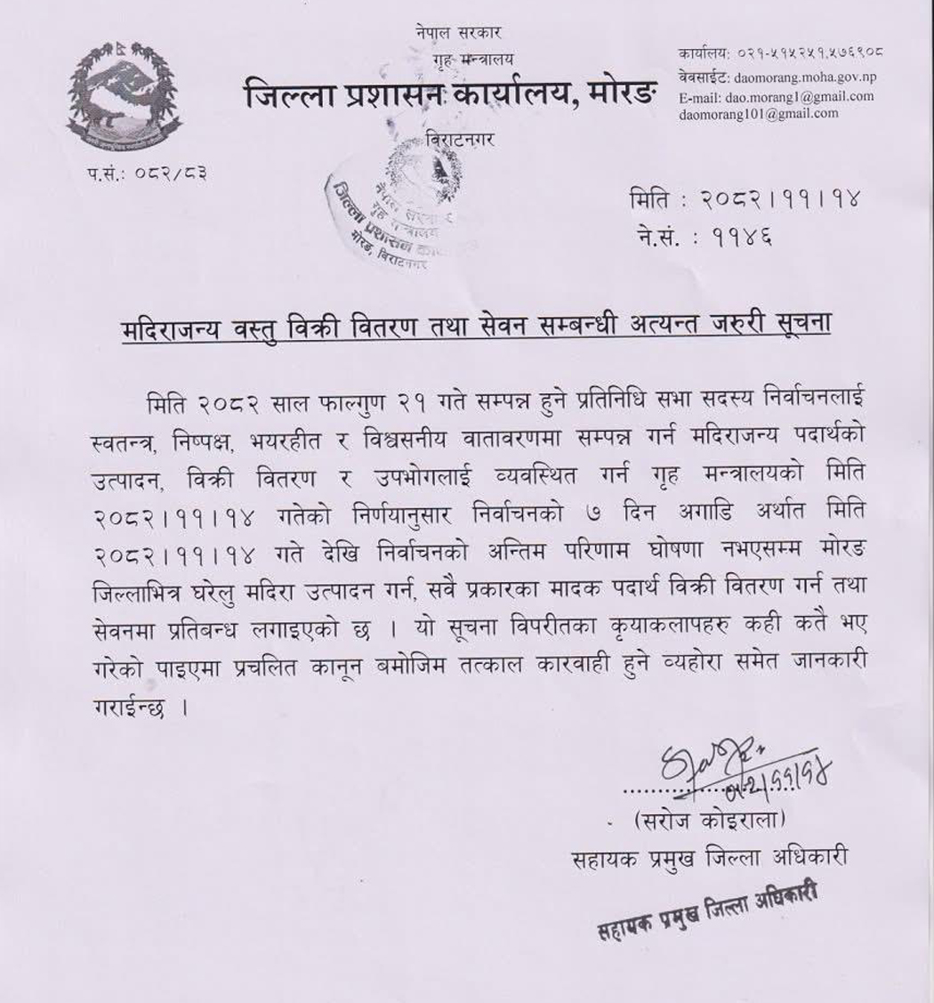विराटनगर । आगामी फागुन २१ गते हुने प्रतिनिधि सभा सदस्य निर्वाचनलाई लक्षित गर्दै मोरङमा मदिराको बिक्री, वितरण तथा सेवनमा पूर्ण प्रतिबन्ध लगाइएको छ ।