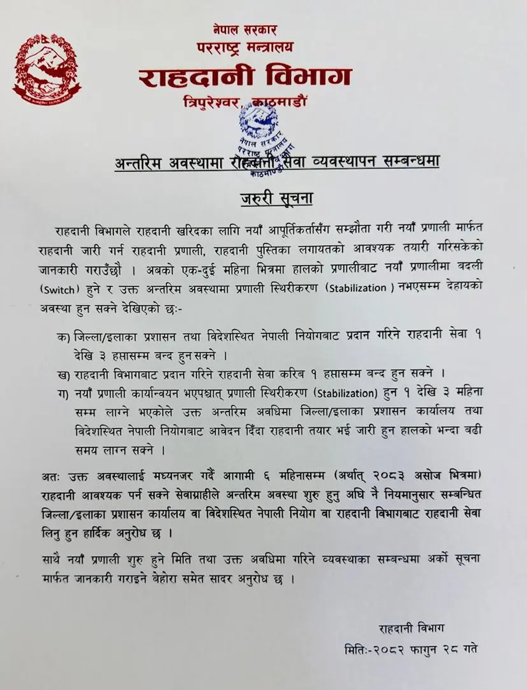 विभागका अनुसार प्रणाली परिवर्तन र सुदृढीकरणका क्रममा जिल्ला तथा इलाका प्रशासन कार्यालयहरू र विदेशस्थित नेपाली नियोगहरूबाट प्रदान गरिने राहदानी सेवा एकदेखि तीन हप्तासम्म बन्द हुन सक्छ ।