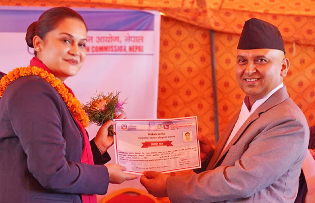 काठमाडौं । फागुन २१ गते सम्पन्न निर्वाचन अन्तर्गत समानुपातिक प्रणालीमार्फत निर्वाचित सांसदहरूले प्रमाणपत्र लिएका छन् । बिहीबार निर्वाचन आयोगले समानुपातिकबाट नवनिर्वाचित सांसदहरूलाई प्रमाणपत्र दिएको हो । आयोगका सचिव कृष्ण बहादुर राउतले सांसदहरूलाई प्रमाण पत्र दिएका छन् ।