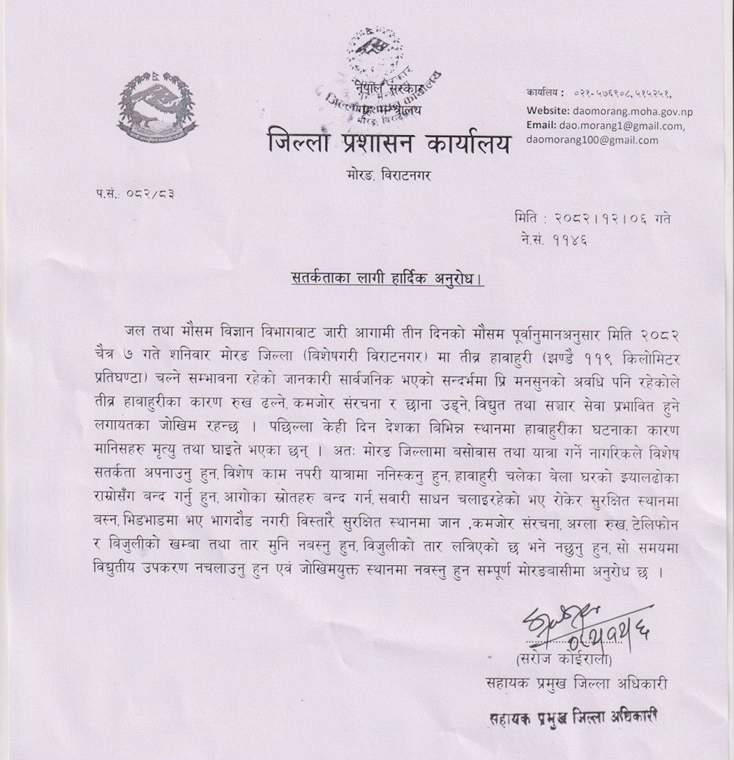 पछिल्ला केही दिनयता देशका विभिन्न स्थानमा चलेको हावाहुरीका कारण मानिसहरूको मृत्यु हुने तथा घाइते हुने जस्ता दुःखद घटनाहरू भइरहेको सन्दर्भमा प्रशासनले विशेष सावधानी अपनाउन अपिल गरेको हो ।