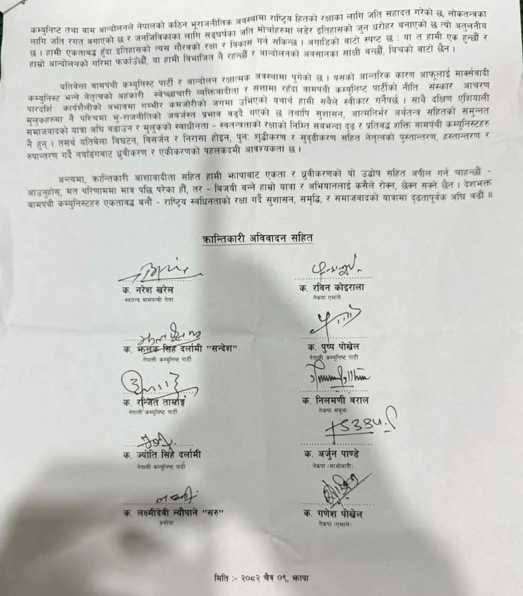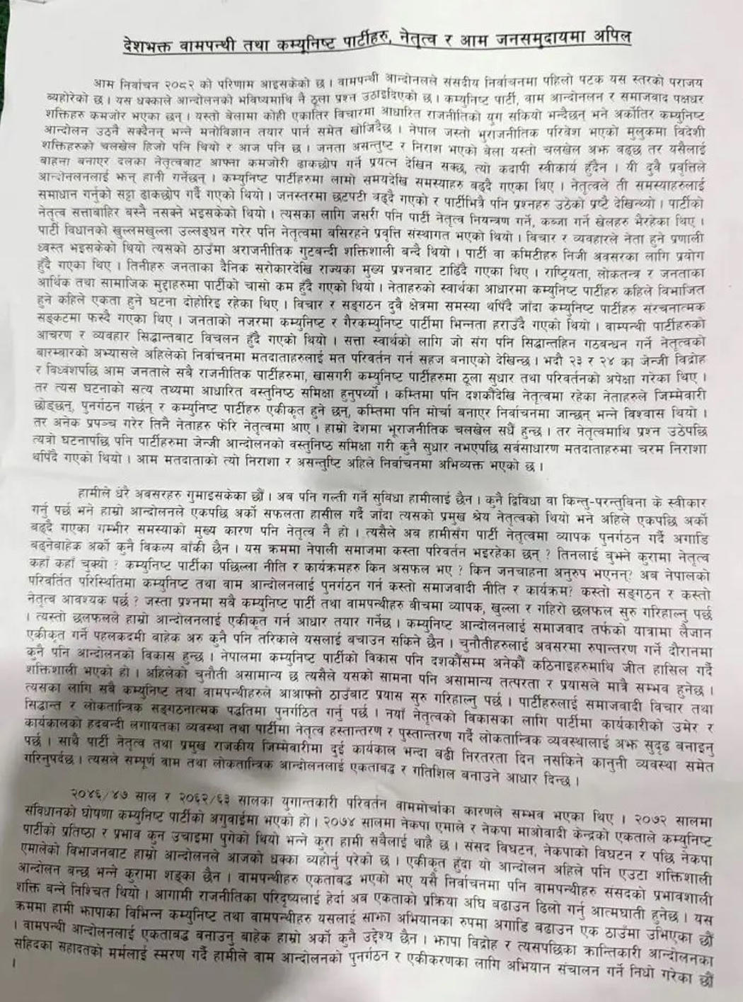 एक संयुक्त अपिल जारी गर्दै विभिन्न कम्युनिष्ट घटकमा आबद्ध १० जना नेताहरूले वर्तमान नेतृत्वको कार्यशैली, वैचारिक विचलन र सत्ता स्वार्थका कारण आन्दोलन रक्षात्मक अवस्थामा पुगेको बताएका हुन् ।